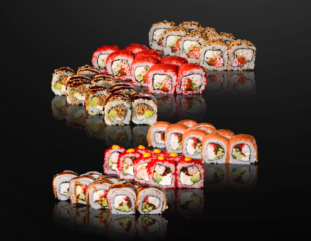 -Філадельфія з вугрем та огірком-Філадельфія з лососем та огірком-Філадельфія з лососем в кунжуті-Філадельфія з креветкою в ікрі-Філадельфія з тунцем в ікрі-Філадельфія в ікрі з лососем- Філадельфія з вугрем в кунжуті-Хрусткий з креветкою-Рол катана Вага 2550 грн 72 шматка